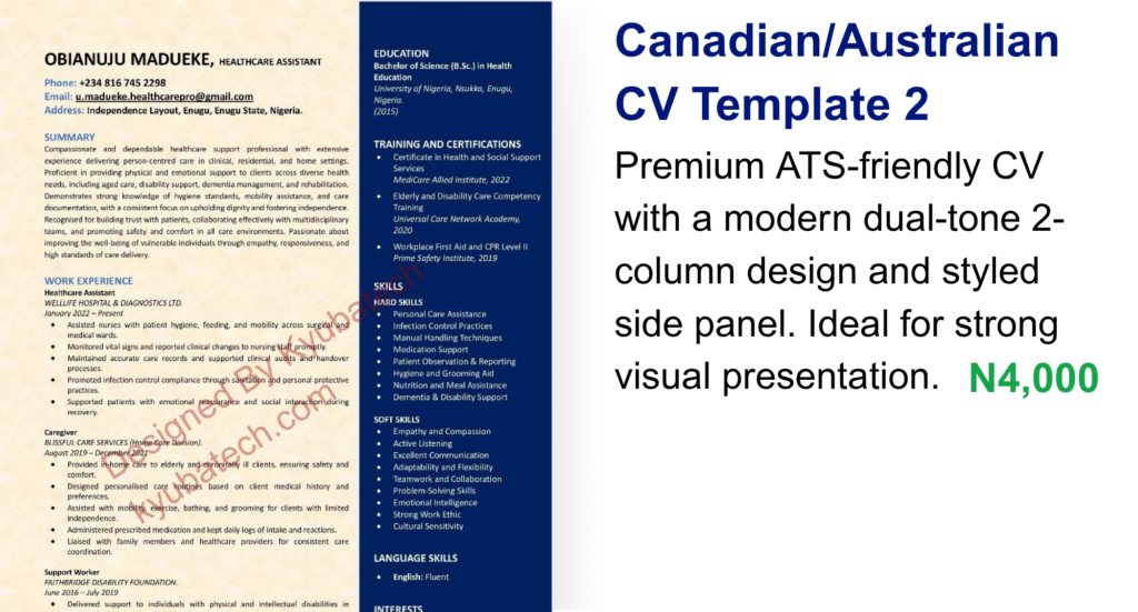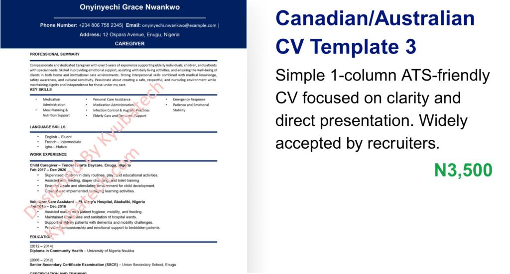 Professionally structured CV templates designed to meet Canadian and Australian job standards, fully ATS-friendly and recruiter-approved in style.