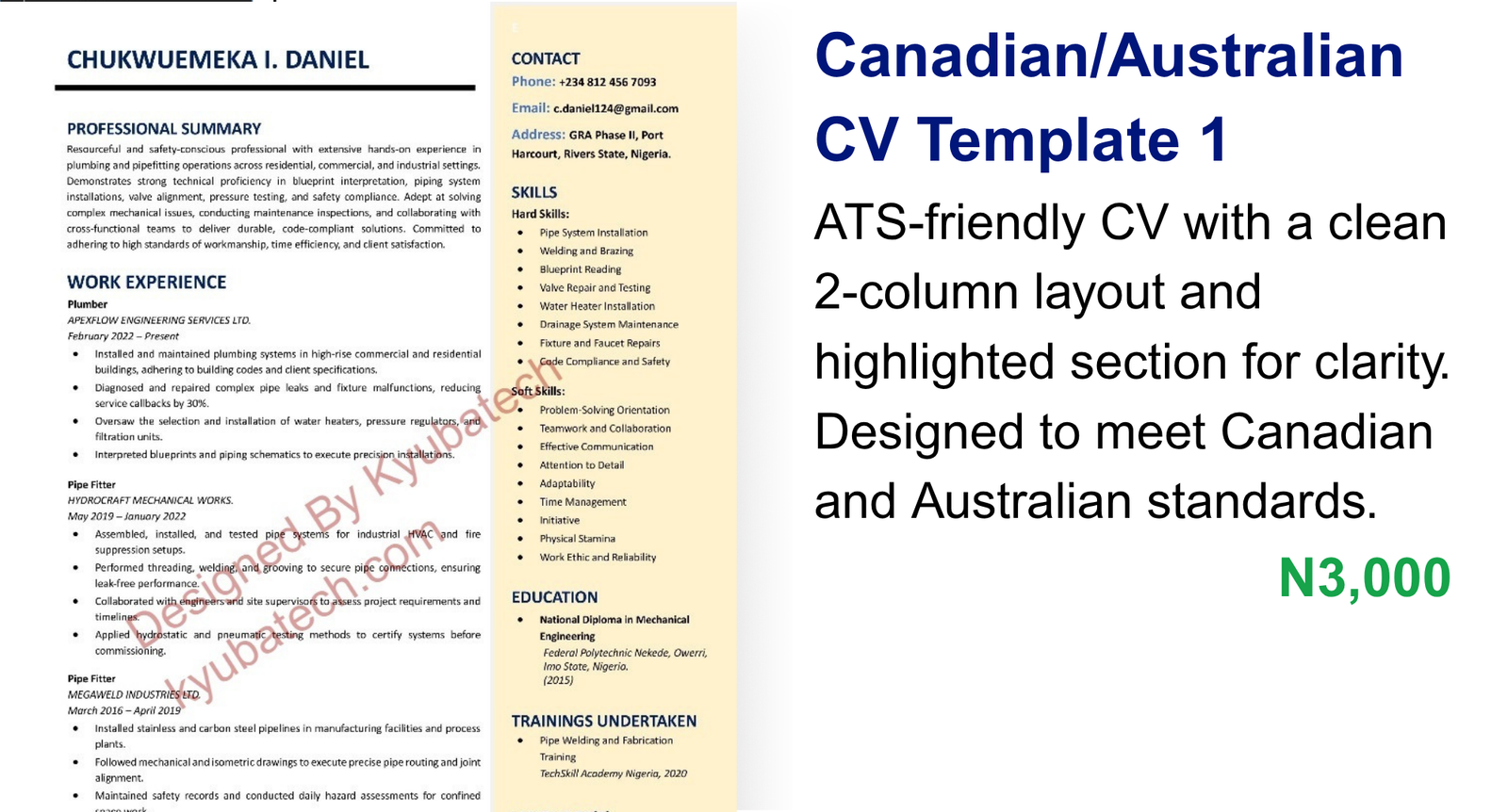 ATS-friendly CV with a clean 2-column layout and well-structured sections for clarity. Designed to meet Canadian and Australian standards. After checkout, our team will contact you via WhatsApp to professionally complete your CV.