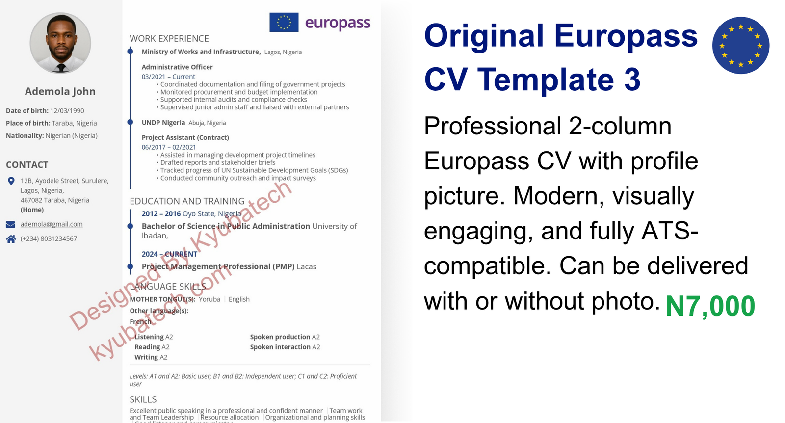 Professional 2-column Europass CV with a profile picture. Modern, visually engaging, and fully ATS-compatible. Suitable for a wide range of roles across Europe. After checkout, our team will contact you via WhatsApp to professionally complete your CV.