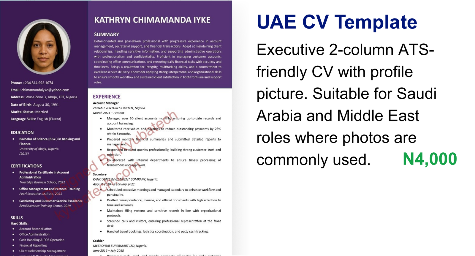 Executive 2-column ATS-friendly CV with profile picture. Ideal for UAE and Middle East job applications where photos are commonly used. After checkout, our team will contact you via WhatsApp to professionally complete your CV.
